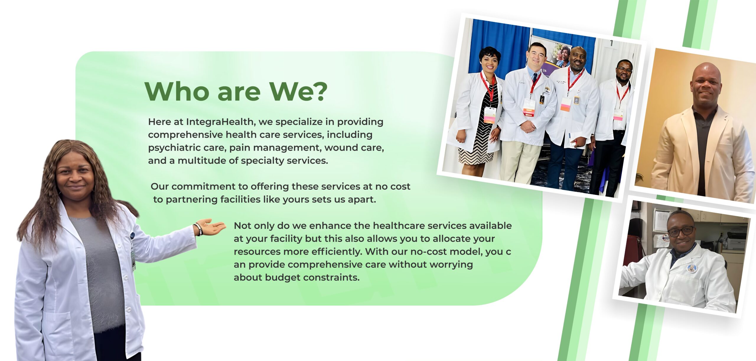 At IntegraHealth, our mission is to provide comprehensive pain management, psychiatric, wound care, and specialty medical services to individuals in need, regardless of their financial circumstances. We are committed to delivering compassionate and high-quality healthcare to our patients, ensuring that they receive the support and treatment they need to improve their health and well-being. Through our dedication to excellence and innovation, we strive to empower our patients to live healthier, happier lives, and to make a positive impact in our communities